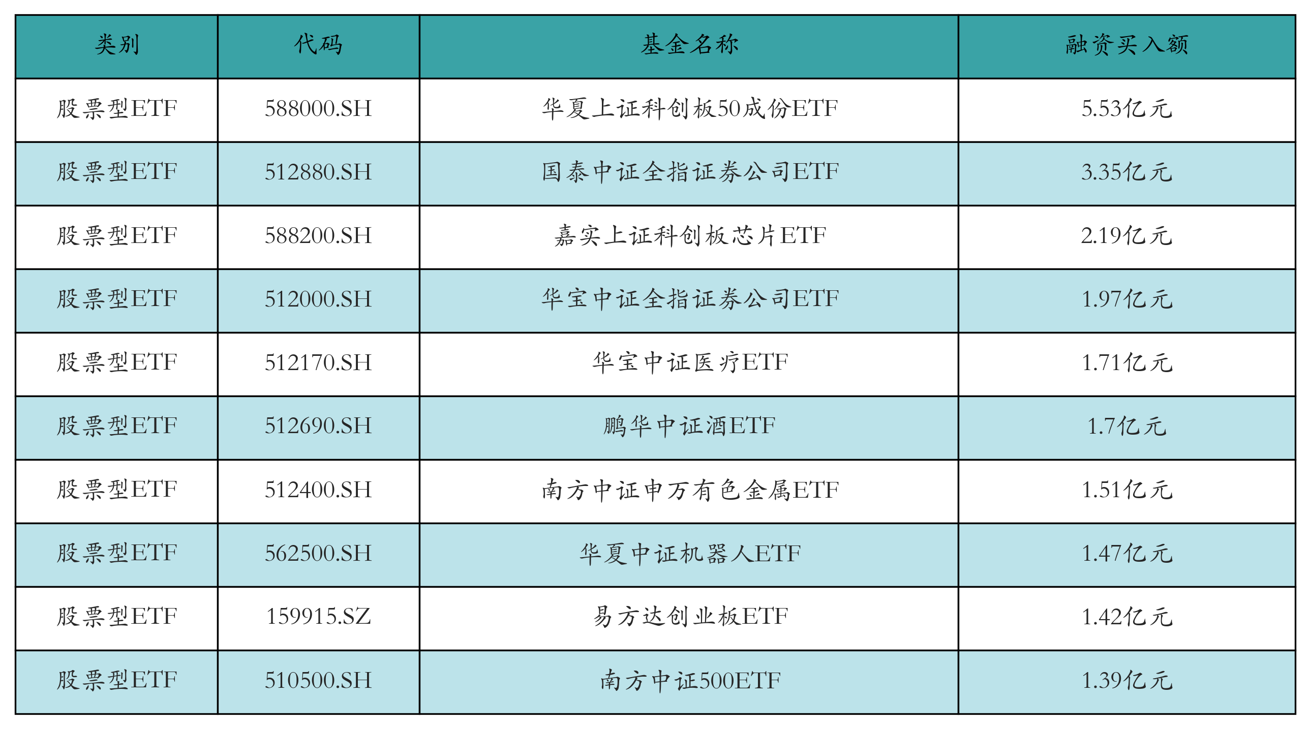昨日股票型ETF融资买入额最高的3只ETF及其买入金额分别为:华夏上证科创板50成份ETF(5.53亿元)、国泰中证全指证券公司ETF(3.35亿元)、嘉实上证科创板芯片ETF(2.19亿元)。融资买入额前10详情见下表:
