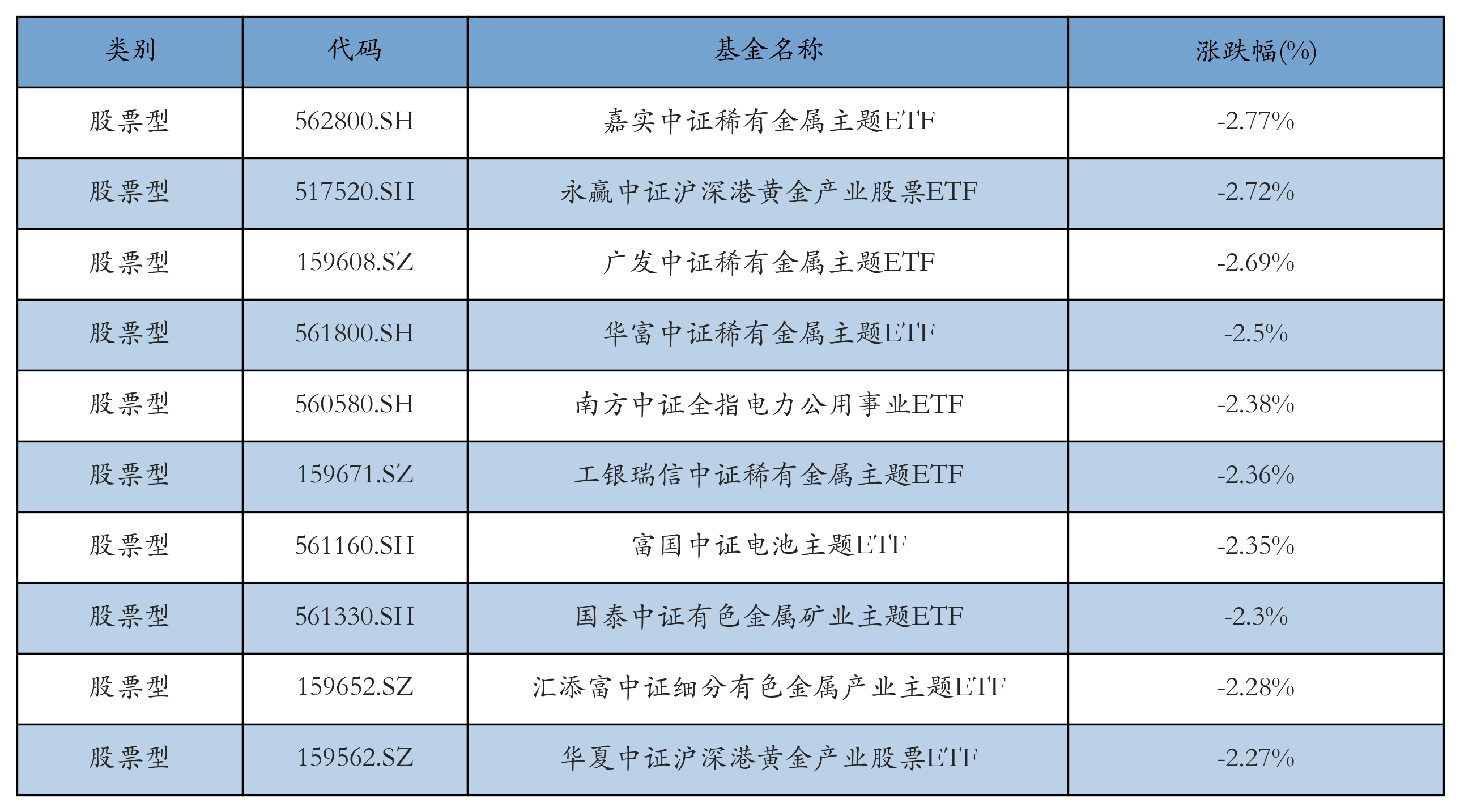 昨日股票型ETF跌幅最大的3只ETF及其收益率分别为:嘉实中证稀有金属主题ETF(-2.77%)、永赢中证沪深港黄金产业股票ETF(-2.72%)、广发中证稀有金属主题ETF(-2.69%)。跌幅前10详情见下表: