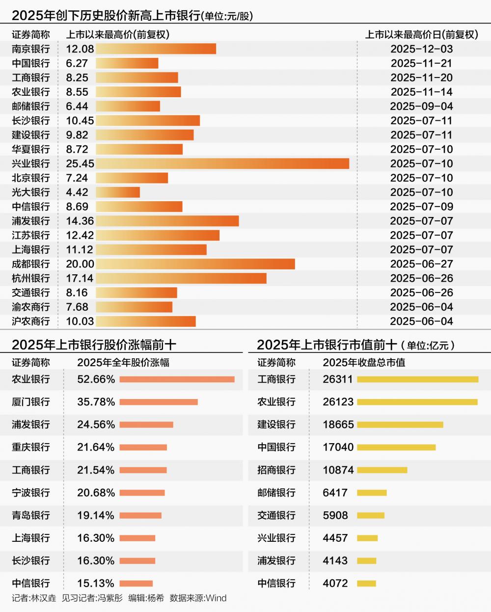 Wind数据显示,截至2025年12月31日收盘,创下股价历史新高的银行股多达20只。