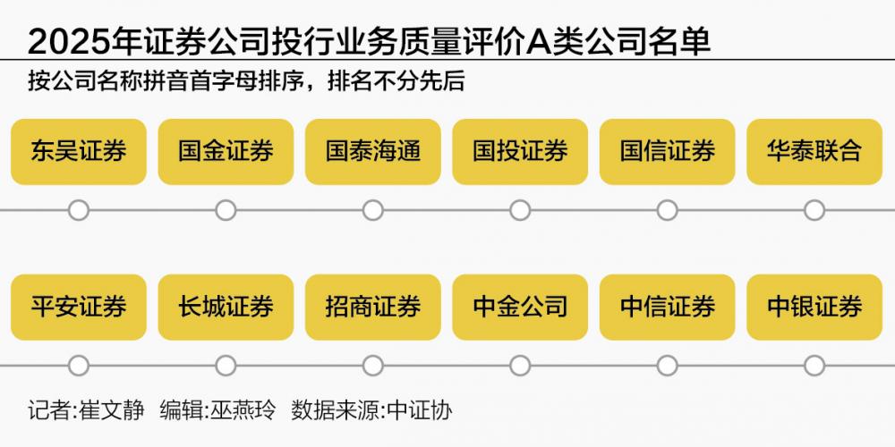 A类券商阵容与投行业务质量评价结果重合度颇高。中信证券、中金公司、国泰海通、招商证券、东吴证券、国信证券、国金证券、平安证券、国投证券这9家券商在两类评价中均跻身A类。