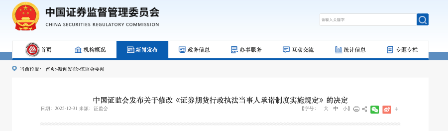《决定》将于2026年2月1日起施行。此次修订是贯彻落实中央金融工作会议精神及新“国九条”关于“完善行政执法当事人承诺制度”要求的具体行动,旨在进一步发挥该制度在快速赔偿投资者、提高行政执法效能、化解市场矛盾方面的独特优势。
