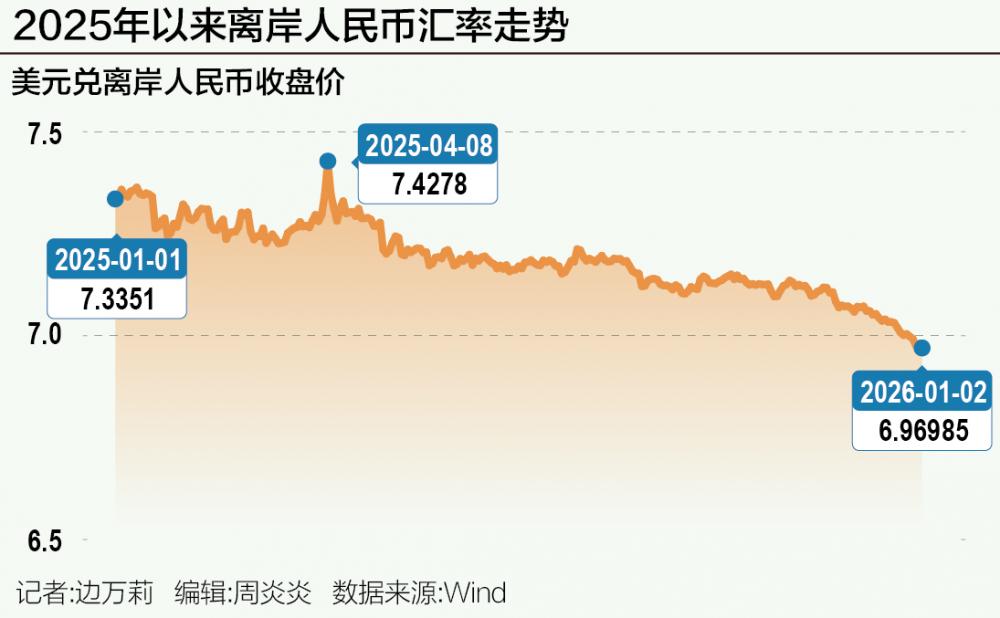 2025年11月下旬,人民币开始呈现明显的单边升值走势,人民币兑美元汇率突破7.1并在不断逼近7的整数关口,持续刷新年内新高。12月25日,离岸人民币升破7,创下2024年9月以来新高;12月30日,在岸人民币兑美元升破7.0关口,最高触及6.9960,涨幅达0.1%,创2023年5月17日以来最高水平。