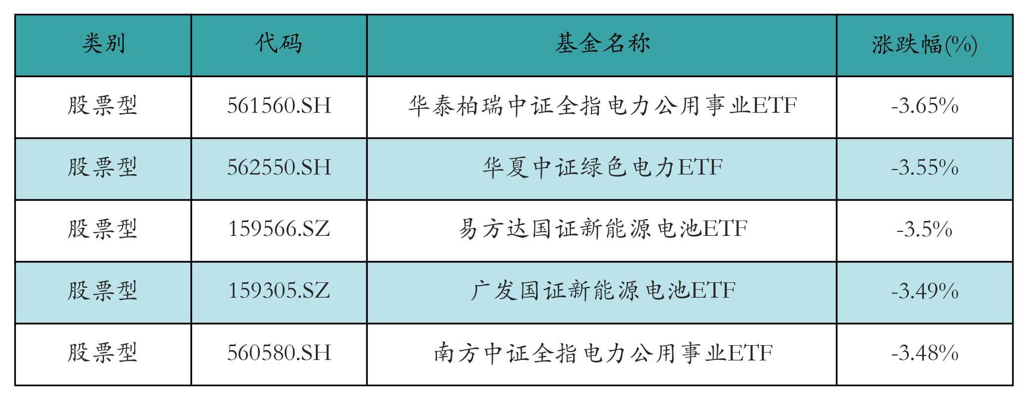 上周股票型ETF跌幅最大的5只ETF及其收益率分别为:华泰柏瑞中证全指电力公用事业ETF(-3.65%)、华夏中证绿色电力ETF(-3.55%)、易方达国证新能源电池ETF(-3.5%)、广发国证新能源电池ETF(-3.49%)、南方中证全指电力公用事业ETF(-3.48%)。详情见下表: