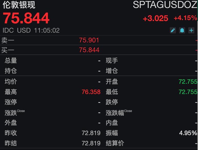 现货白银(伦敦银现)表现更为迅猛,日内大涨4.15%,现报75.844美元/盎司,贵金属牛市格局获强势强化。