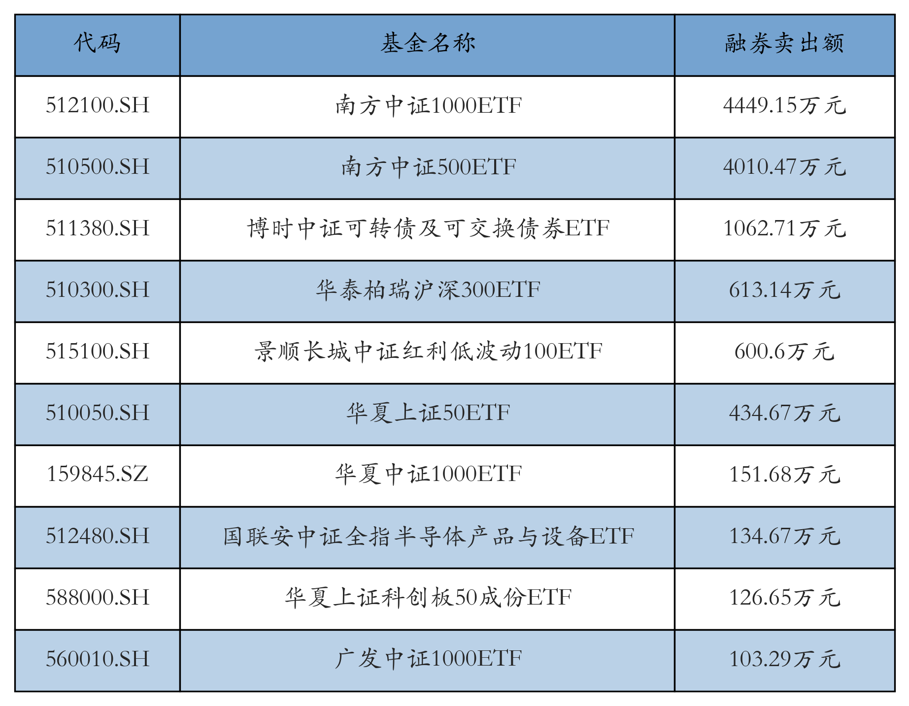 12月31日ETF融券卖出额前三位分别为:南方中证1000ETF(4449.15万元)、南方中证500ETF(4010.47万元)和博时中证可转债及可交换债券ETF(1062.71万元),前10具体见下表: