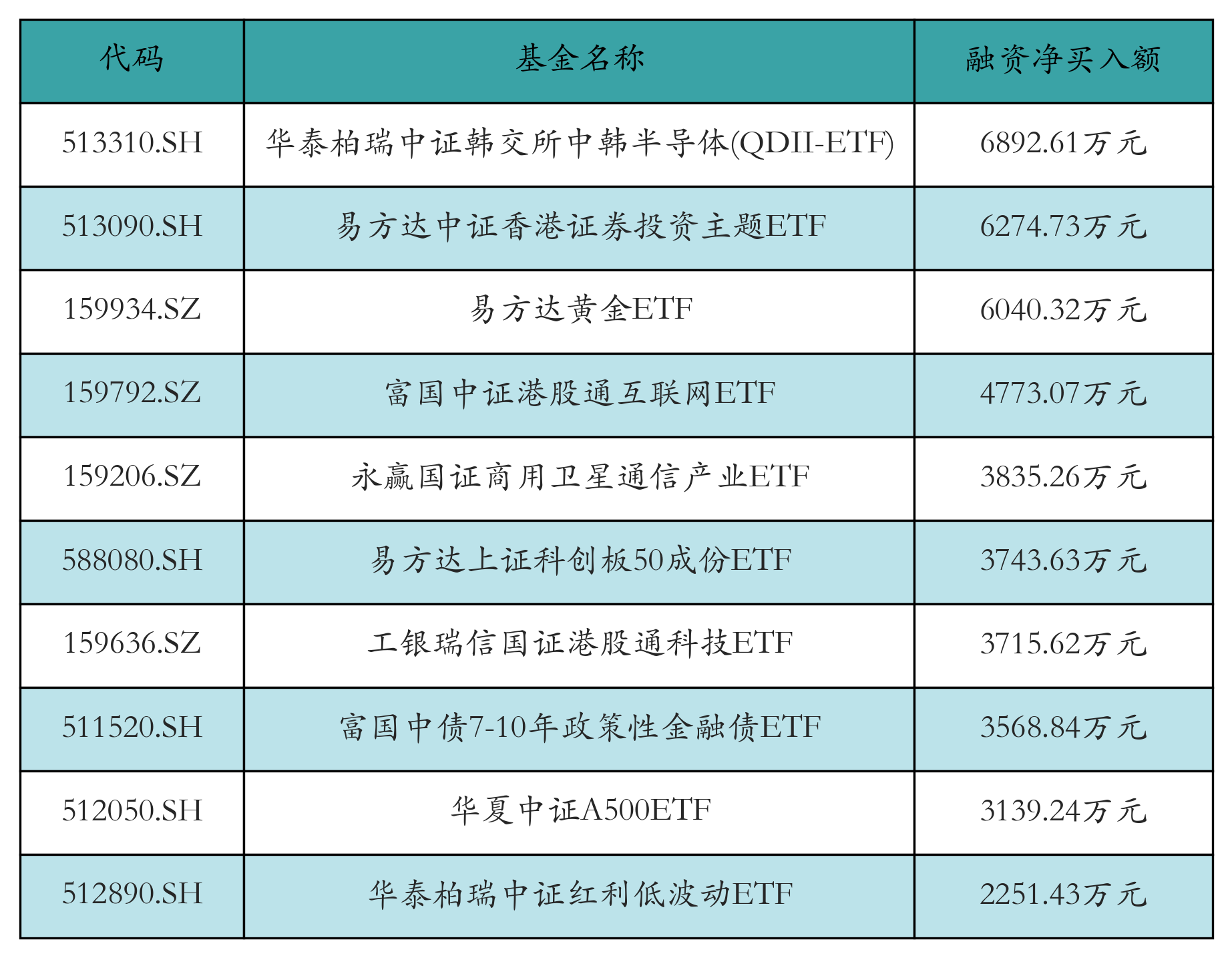 12月31日ETF融资净买入额前三位分别为:华泰柏瑞中证韩交所中韩半导体(QDII-ETF)(6892.61万元)、易方达中证香港证券投资主题ETF(6274.73万元)和易方达黄金ETF(6040.32万元),前10具体见下表: