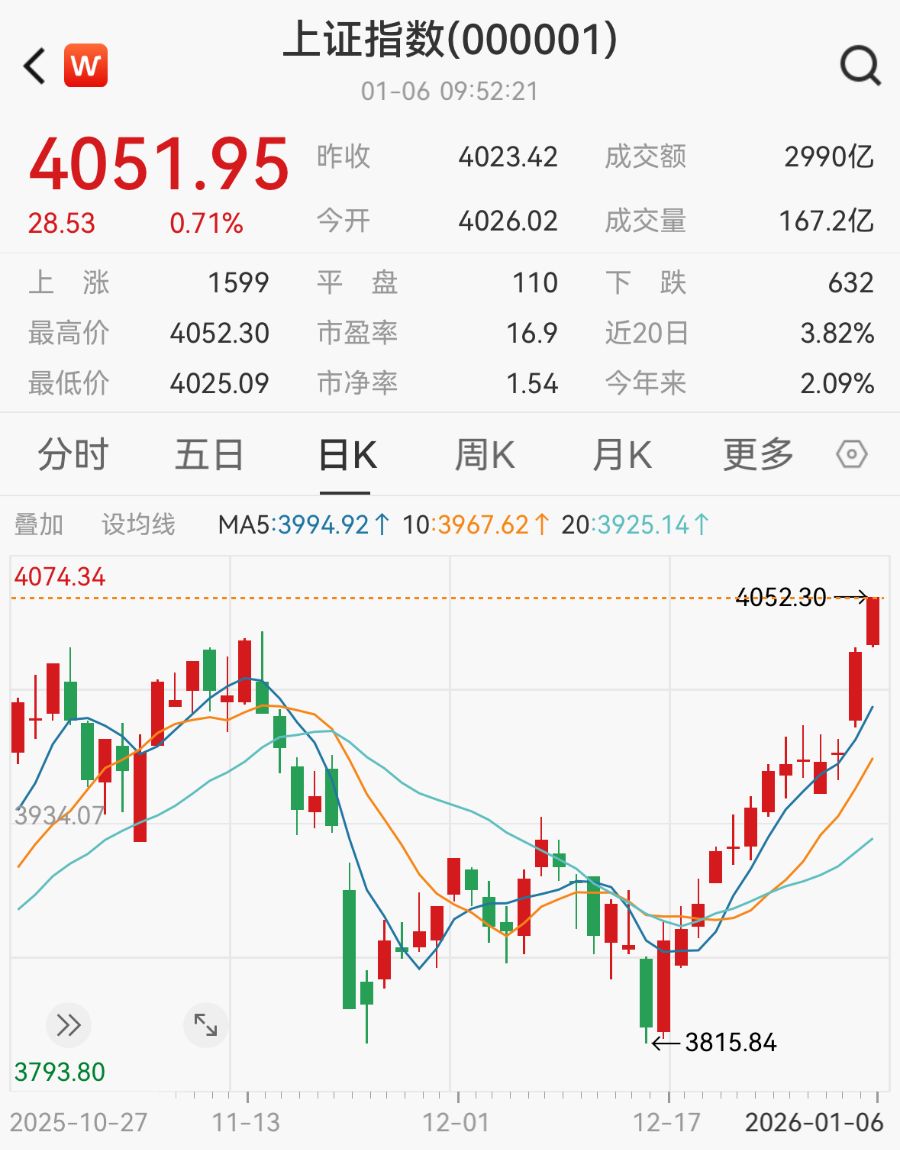 1月6日,上证指数突破前高4034.08点,刷新10年来新高。截至9:52,报4051.95点,涨0.71%,延续“开门红”走势。