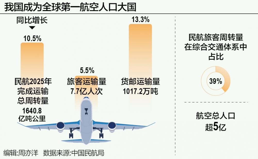 2025年,我国民航全年完成运输总周转量1640.8亿吨公里、旅客运输量7.7亿人次、货邮运输量1017.2万吨。