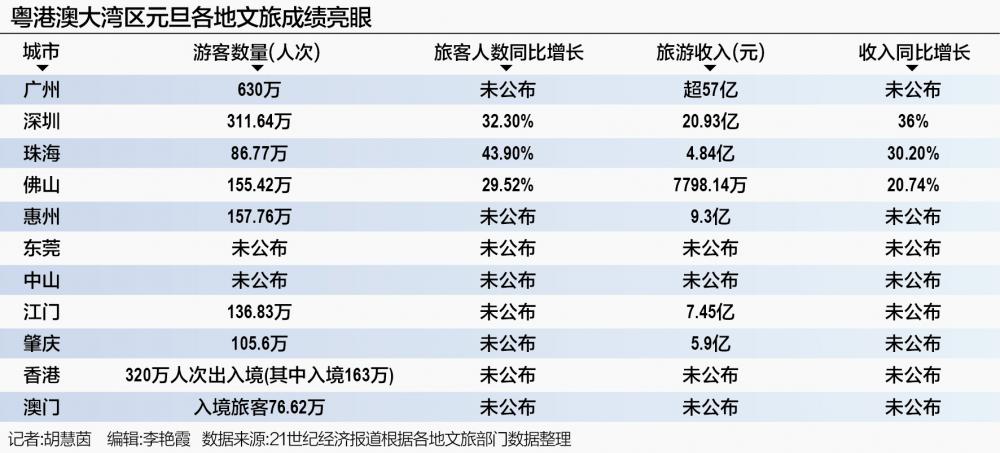 据南方财经全媒体记者不完全统计,粤港澳大湾区已公布数据的主要城市累计接待游客总量超2000万人次。受益于粤港澳大湾区“一小时生活圈”效应,大湾区城市间的中短途、周边游成了游客出行新选择。与此同时,“为演出奔赴一座城”的现象在元旦假期尤为突出,以演唱会、各类体育赛事为代表的“文旅+”模式激活更大的消费潜力。