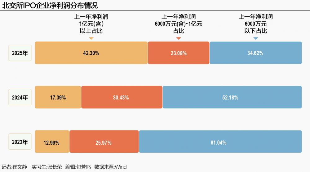 从细分数据来看,北交所新上市企业中,上市前一年净利润突破1亿元的企业占比持续攀升,2023年为12.99%,2024年提升至17.39%,2025年更是大幅跃升至42.3%。这意味着,当前超四成的北交所新上市企业,上市前净利润已突破1亿元,达到A股所有板块的上市利润要求。