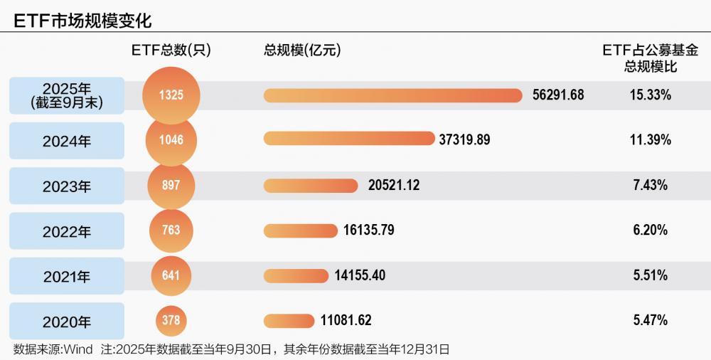 数据显示,在2020年末,ETF还是占公募基金总规模比重仅5.47%的“小角色”,但在2025年三季度末,这一数字已增至15.33%,几乎翻了两倍。在公募总规模稳步增长的进程中,ETF以显著的增速“超车”向前,意味着其不仅是跟随行业发展大势,更是在凭借自身的优势,成为资产配置工具中日益重要的一极。