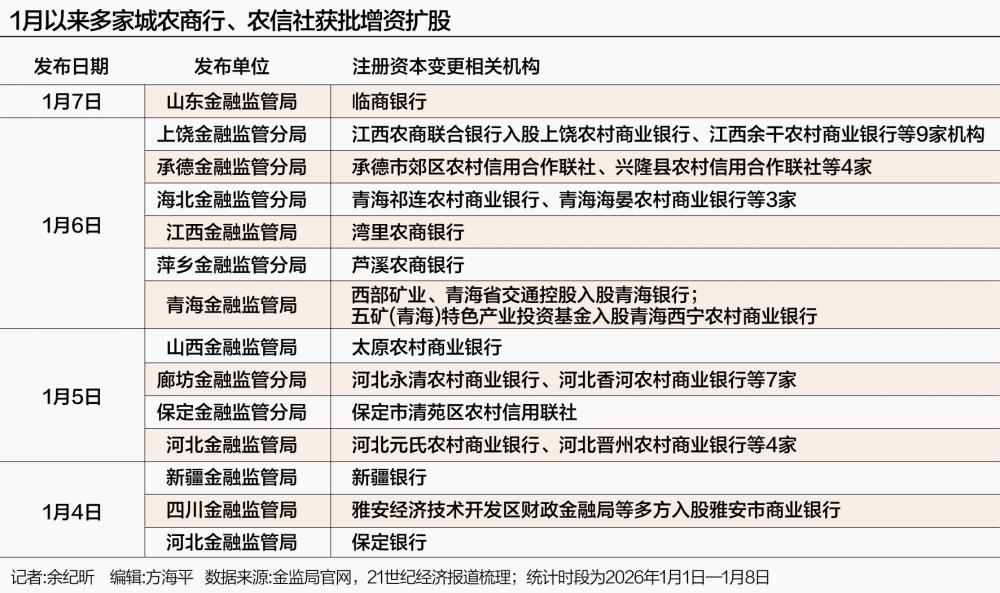 21世纪经济报道记者据国家金融监督管理总局官网公告初步梳理统计,仅2026年1月1日至1月8日,全国就有37家城商行、农商行及农信社获批变更注册资本。从机构类型看,此次“增资潮”中,农村商业银行、农村信用合作社为绝对主力,同时也包含临商银行、青海银行等多家城商行。