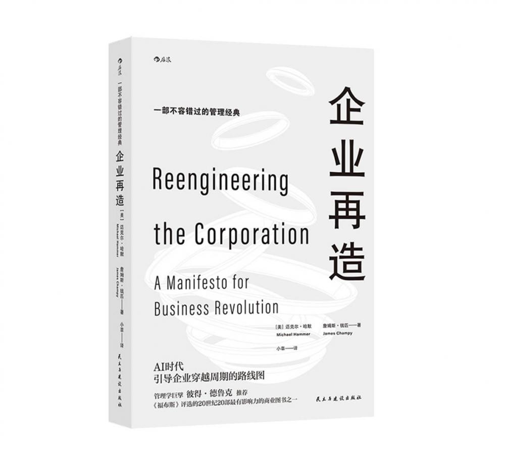 这本书的封面赫然写着“管理学巨擎彼得·德鲁克推荐”,显然是对迈克尔·哈默(Michael Hammer)与詹姆斯·钱皮(James Champy)合写的《企业再造:商业革命宣言》的最高肯定。该书的确是一本不容错过的管理经典书籍,还是《福布斯》所评的“20世纪20部最具影响力商业图书”之一。