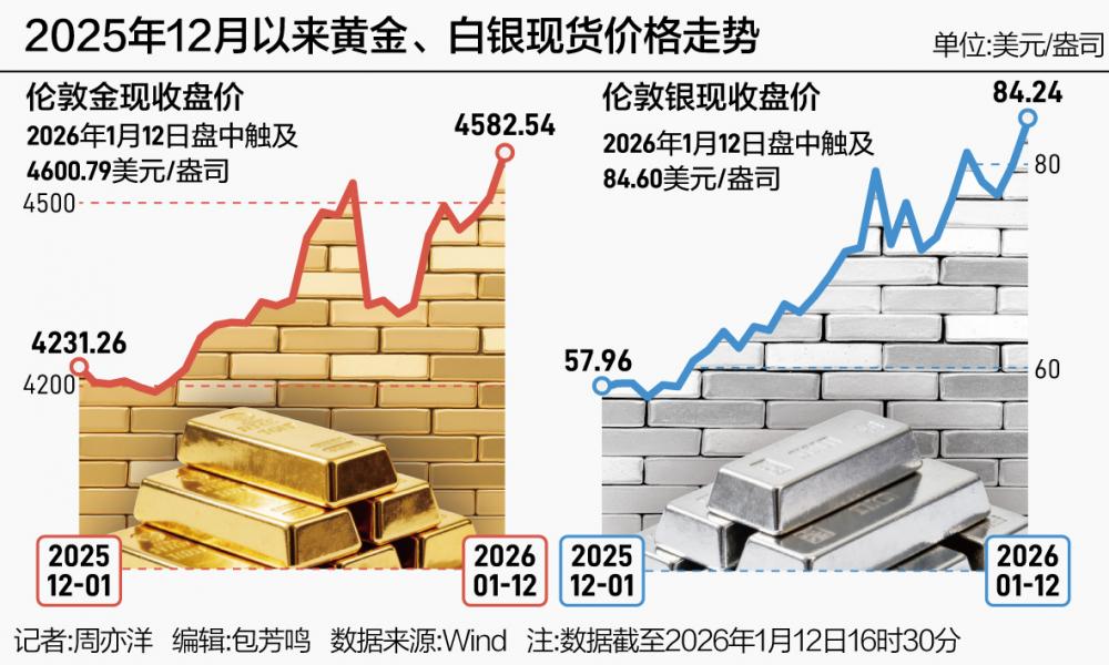 东方金诚研究发展部高级副总监瞿瑞、东方金诚研究发展部高级副总监白雪在接受记者采访时表示,1月12日,黄金、白银价格双双创新高,或源于美国司法部向就美国联邦储备委员会华盛顿总部翻修相关事宜,对美联储主席鲍威尔启动刑事调查。市场对美联储独立性的担忧再起,美元指数、美股期指随之走弱,进而导致国际黄金、白银价格再创新高。