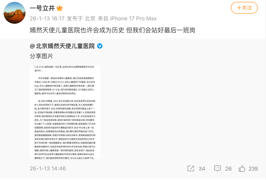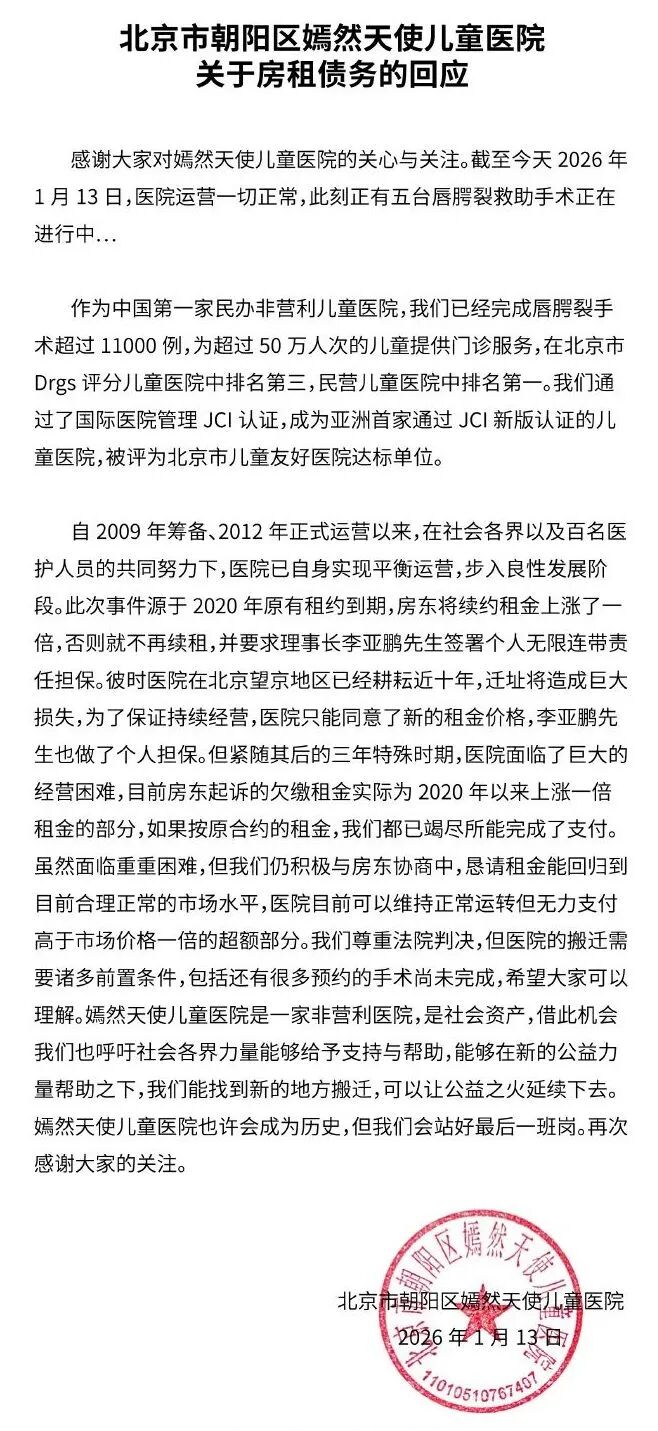 1月13日,@北京嫣然天使儿童医院 发布关于北京市朝阳区嫣然天使儿童医院关于房租债务的回应: