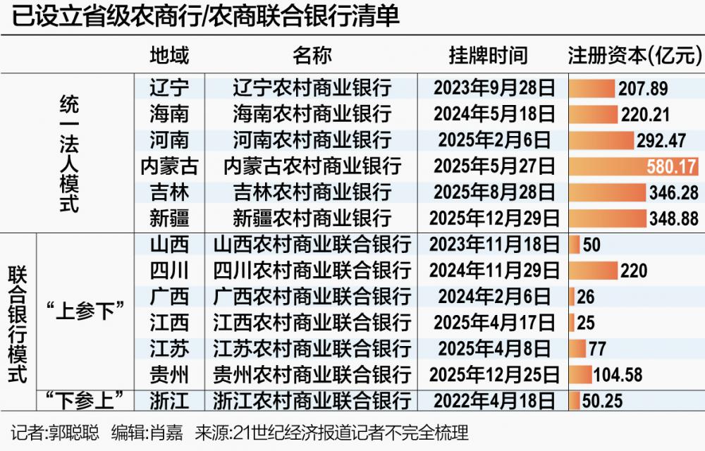 据21世纪经济报道记者不完全统计,截至1月13日,已有13家省级联社完成省级法人机构组建,其中贵州、江西等7省份采用联合银行模式,内蒙古、河南、新疆等6省份采用统一法人农商银行模式。