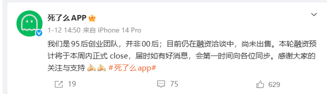 1月12日,“死了么”APP官方微博发文称,“目前仍在融资洽谈中,尚未出售。本轮融资预计将于本周内正式关闭,届时如有好消息,会第一时间同步。”