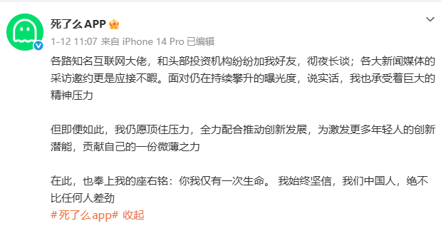1月13日晚,“死了么APP”官方微博发文宣布改名。
