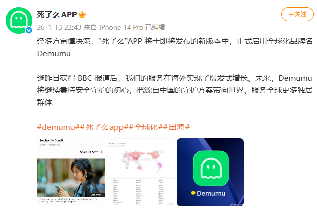 “死了么APP”团队表示,经多方审慎决策,“死了么”APP 将于即将发布的新版本中,正式启用全球化品牌名 Demumu。