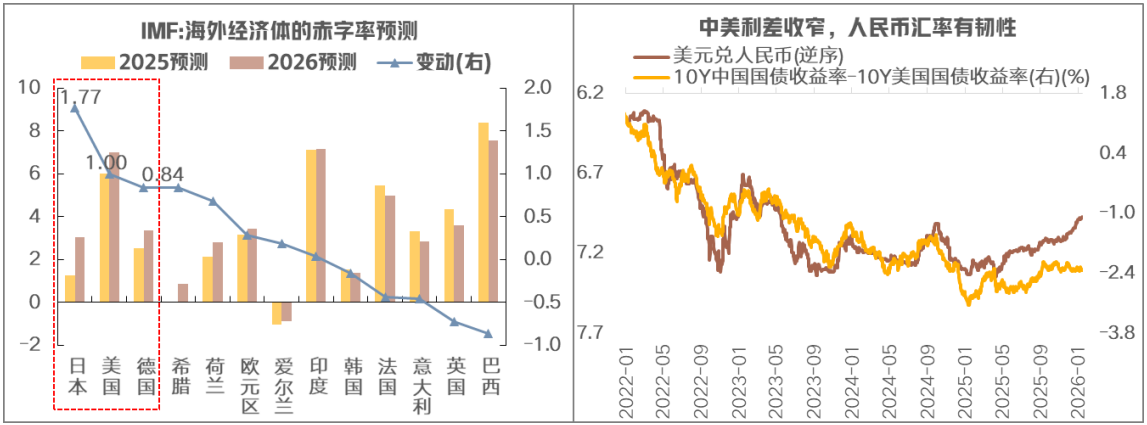 整体而言,在“全球经济信用周期向上+人民币汇率韧性+中国竞争地位抬升”的背景下,要重视人民币资产的配置价值。第一,2026年美日欧财政政策或将同步扩张。美国《美丽大法案》生效,德国“财政刹车”解除,日本推出经济刺激计划,所带来的结果是,2026年全球信用周期有望共振向上。根据IMF的预测,2026年日本、美国、德国的赤字率有望比2025年分别提升1.77、1.00、0.84个百分点。第二,2026年人民币汇率有韧性,或稳中有升。在美日欧货币政策分化叠加美国债务风险积聚的背景下,美元指数或维持低位震荡,而人民币汇率在“中美利差收窄+结汇需求上升”的背景下,或稳中有升。第三,中国在全球的竞争力明显抬升,“十五五”更要战略主动。今年以来,在外围摩擦升级的背景下,中国出口增速依然强劲,主要系非美国家的需求尤为旺盛,包括对东盟的设备出口,对欧盟、非洲等地区的汽车、工程机械出口等,而这背后的核心是中国制造业的竞争地位明显抬升,这从中国和非美国家的贸易结合度的趋势上行能够得到验证。