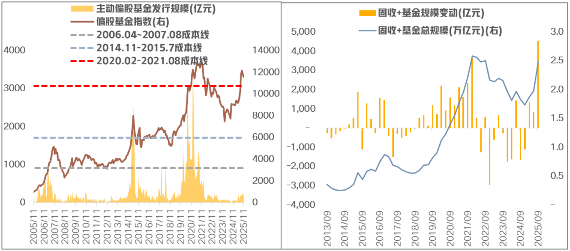 2026年最核心的微观变量是居民资金的入市情况,决定市场节奏。自“9.24”以来,A股赚钱效应不断抬升,但从主动权益新基金发行看,目前仅低位回暖,并没有出现明显放量,这也就意味大量居民资金或还没有进场,但明年有望加速。其一,居民资金资金偏“右侧”,所以“跑步入场”往往需要等基金整体净值突破上一轮密集发行区间的“成本线”,叠加赚钱效应的进一步积聚,才会吸引更多资金借基入市,而事实上,今年9月份后,基金净值整体才突破20-21年密集发行的成本线。其二,历史上看,居民增配权益资产不是一簇而就的,其风险偏好也是逐步抬升的,本轮或先“固收+”后权益。根据Wind统计,2025Q3,“固收+”基金规模增加超4500亿元,已创下历史新高。其三,从“居民存款/A股总市值”看,目前这一比值仍在1.52的历史高位,距离1.1左右的历史低位,仍有较大空间,这也就意味着“存款搬家入市”或远未结束。