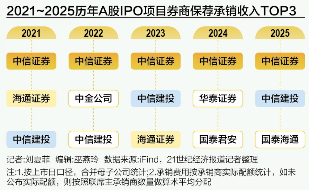 2021~2025年,A股IPO保荐承销费用收入的第二名分别是海通证券、中金公司、中信建投、华泰证券和中信建投。