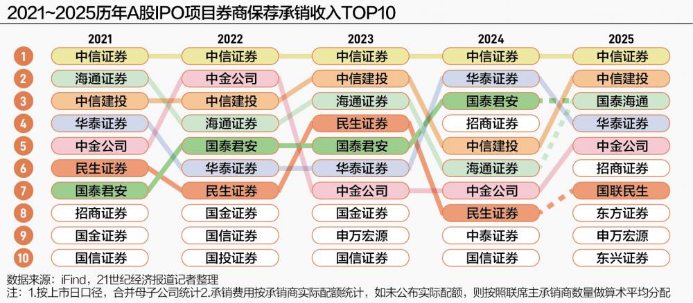 2021~2025年,A股IPO保荐承销费用收入的第二名分别是海通证券、中金公司、中信建投、华泰证券和中信建投。