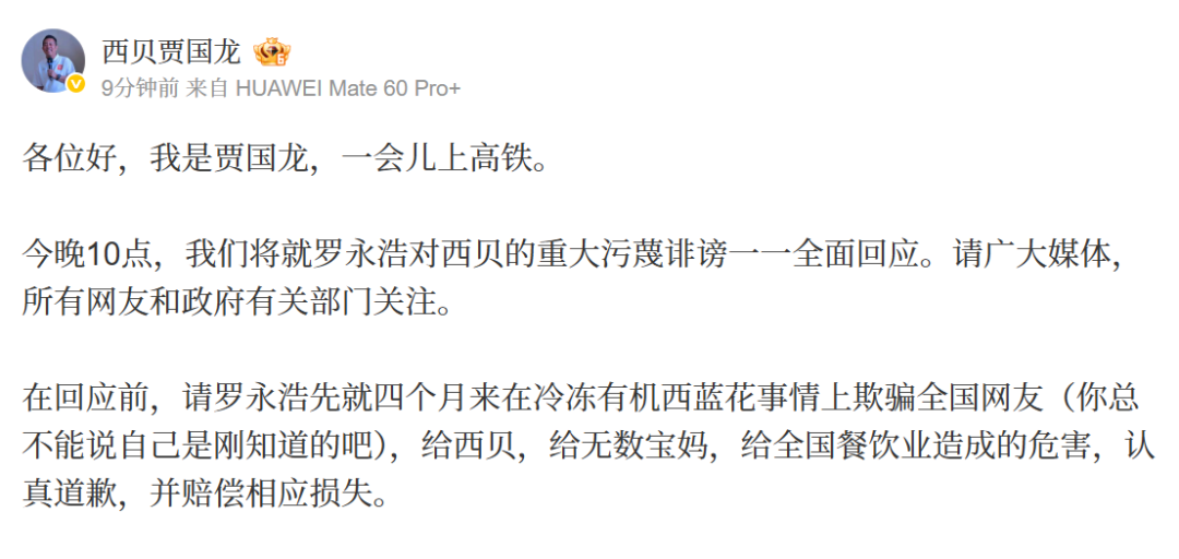 贾国龙:今晚10点,将就罗永浩对西贝的重大污蔑诽谤一一全面回应