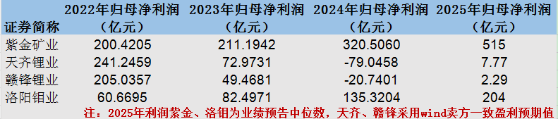 2022年,紫金矿业(601899.SH)、天齐锂业(002466.SZ)与赣锋锂业(002460.SZ)盈利曾达到这一水平,但受到金、铜、锂价格波动影响,这几家公司盈利走势、市值表现差异越来越大。