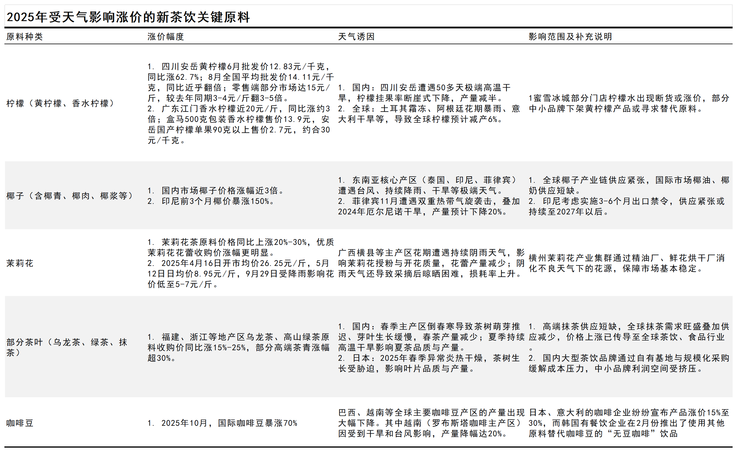 不过,行业过往的粗放式扩张,让供应链体系短期内积累了诸多待解痛点。一方面,水果等原料本身损耗率较高,部分品牌为压缩成本,刻意简化冷链流程、延长仓储周期,不仅进一步推高损耗,更有品牌出现以次充好的情况,短期内透支了行业信任;另一方面,全球极端天气频发,对柠檬、咖啡、茶叶等核心原料的品质与价格稳定构成不小考验,给供应链带来持续不确定性。