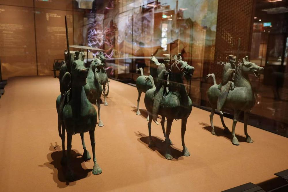展览的开篇,一组出土自甘肃武威雷台汉墓的铜车马仪仗俑队,以其威严阵仗,一下子把观众带回那个开拓的时代。这组来自甘肃省博物馆的镇馆之宝,共有24件,分别为最前方持矛及持戟的骑士,后方骏马扬蹄嘶鸣的从骑,以及带伞的轺车等,精细还原了汉代高级官员出行的威仪,是汉朝经略西域、守护丝路贸易的缩影。其中,那匹著名的铜奔马(又称“马踏飞燕”)虽未亲临,但其同组文物已足以令人想见汉帝国的气度与雄心。