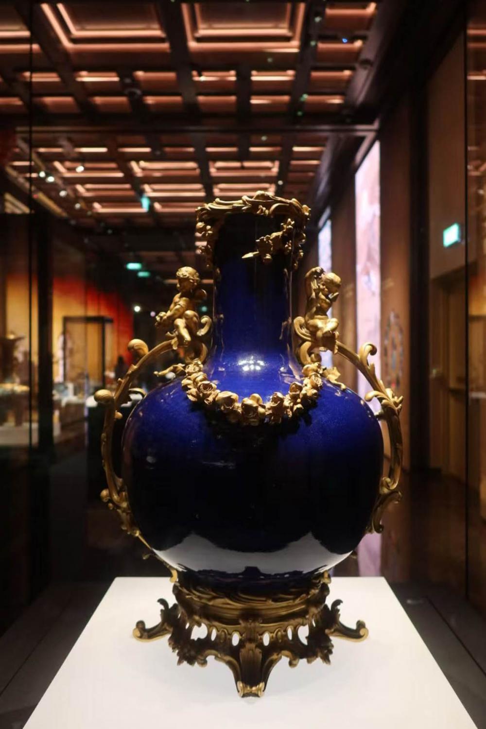 展览中的雍正年间霁蓝釉天球瓶(带西洋铜饰),就是这种跨文明工艺融合的极致体现。这件天球瓶通体宝石蓝般的釉色温润华贵,表面装饰着茛苕、婴孩等图案的西洋铜饰,将东方瓷器的典雅与西方金属工艺的精巧完美结合。据介绍,这种在瓷器表面包覆金属的做法,最早可追溯至宋代,初衷是遮蔽瓷器缺陷。而随着明清时期中国瓷器沿丝路大量外销,铜饰的装饰功能日益凸显,欧洲贵族甚至专门聘请铜匠为订购的中国瓷器添加繁复西洋纹饰。这些精心的“二创”让其成为了丝路贸易中双向奔赴的审美见证。