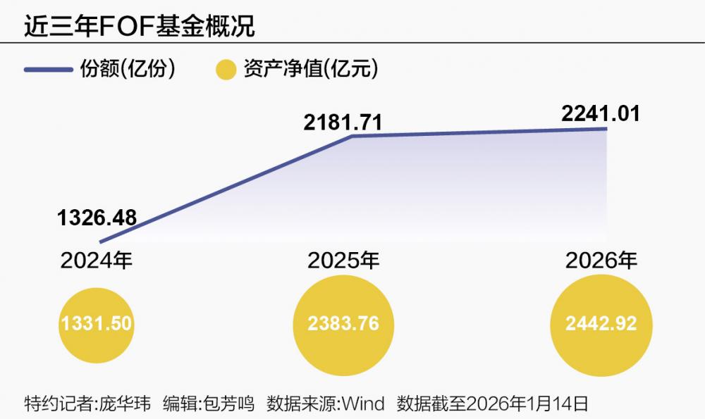 份额方面,全市场FOF总份额达2241.01亿份,较2025年末增长约2.72%,而2025年全年增长约65%。