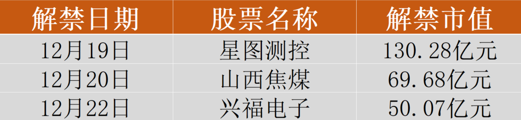 ➤Wind数据显示,。本周(1月19日—1月23日)五个交易日将有39只股票面临限售股解禁,合计解禁量为34.47亿股。按1月16日收盘价计算,合计解禁市值为464.99亿元。其中,解禁市值居前三位的是:星图测控(131.30亿元)、山西焦煤(69.68亿元)、兴福电子(50.07亿元)。