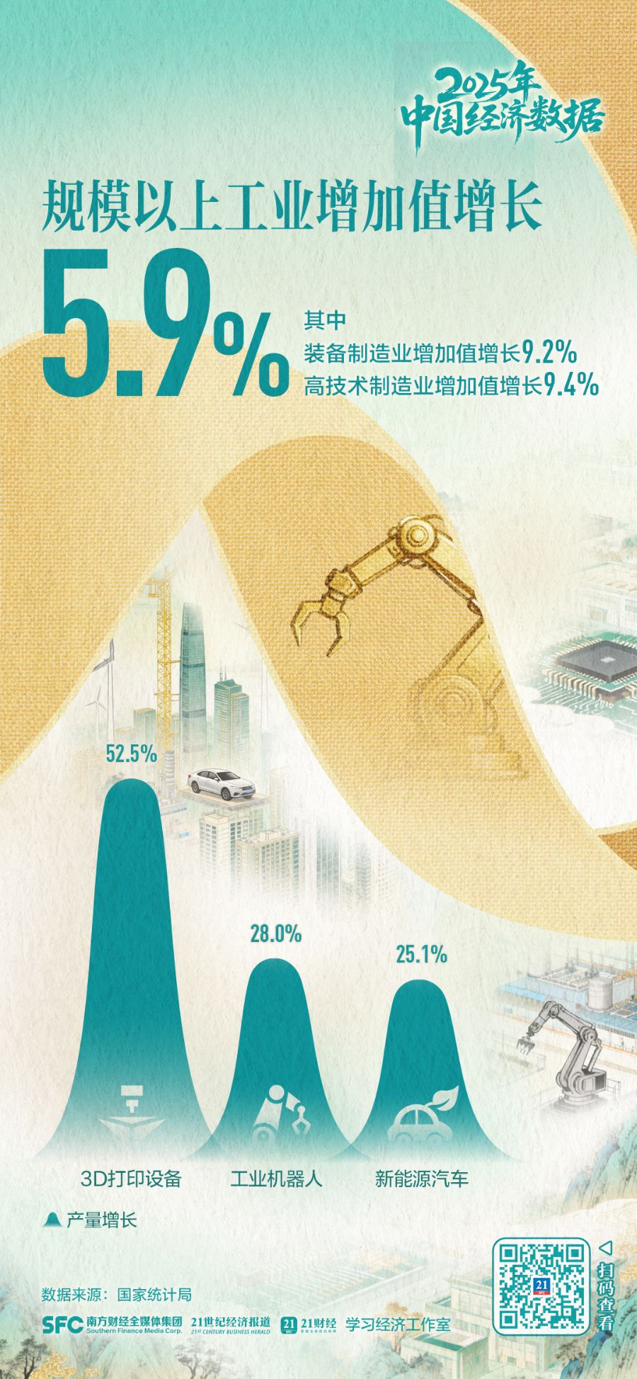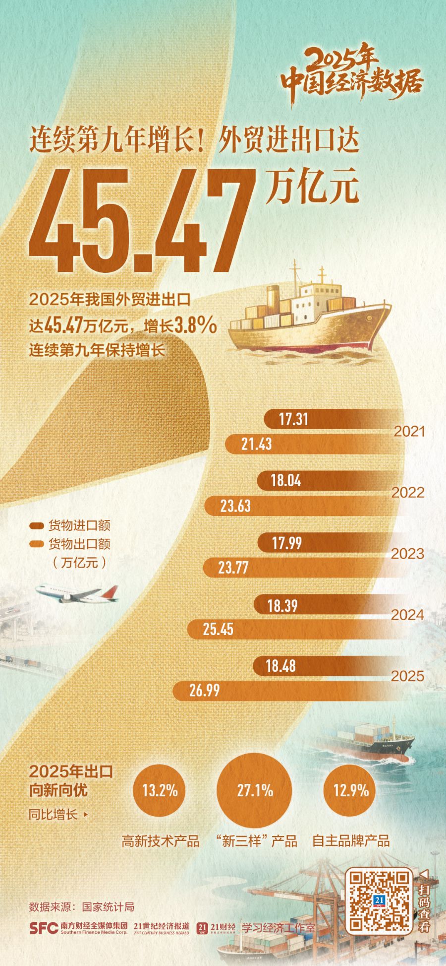 2026年1月19日,国务院新闻办公室举行新闻发布会,介绍2025年国民经济运行情况。国家统计局有关负责人表示,2025年,国民经济运行顶压前行、向新向优,高质量发展取得新成效,经济社会发展主要目标任务圆满实现,“十四五”胜利收官,第二个百年奋斗目标新征程实现良好开局。对于过去一年的经济表现,有关负责人用“稳、进、新、韧”这四个字来作概括。