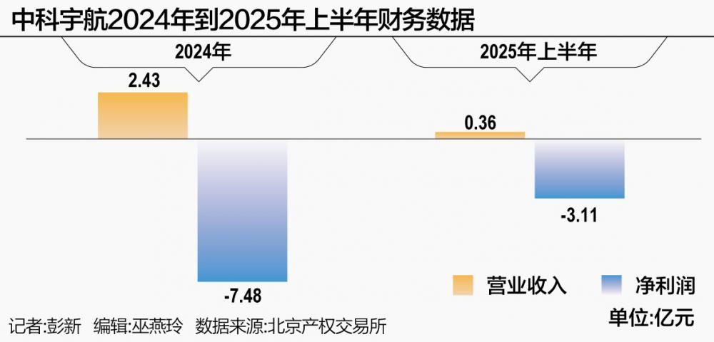 前述北京产权交易所挂出的股权转让信息显示,中科宇航2024年实现营业收入2.43亿元,净利润为-7.48亿元;2025年上半年,公司实现营业收入3624.13万元,净利润为-3.11亿元。