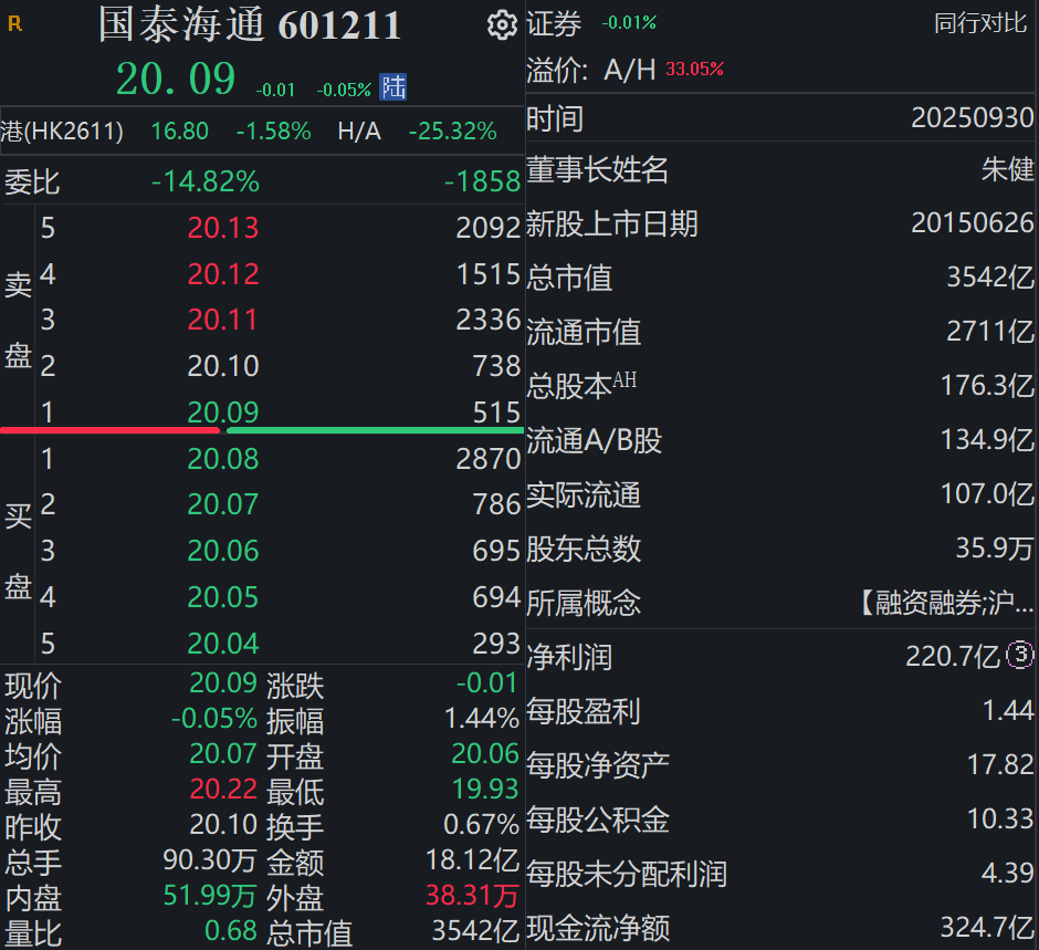 截至1月19日收盘,国泰海通总市值达3541.65亿元,A股(601211.SH)报20.09元,跌幅0.05%;港股(02611.HK)报16.8港元,跌幅1.58%。