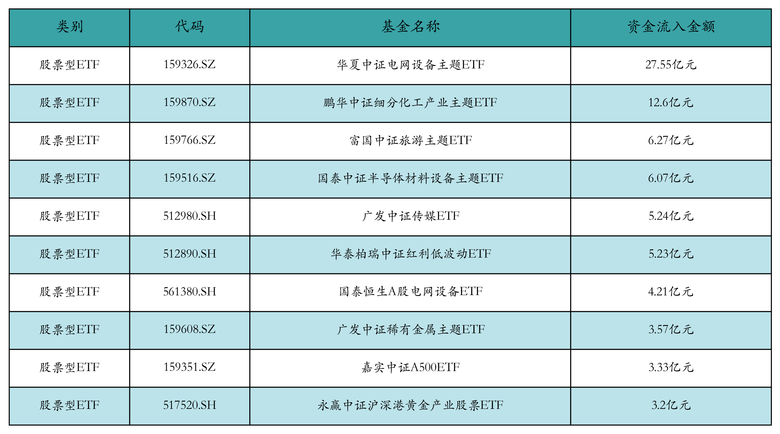 昨日股票型ETF资金流入最多的3只ETF及其流入金额分别为:华夏中证电网设备主题ETF(流入27.55亿元)、鹏华中证细分化工产业主题ETF(流入12.6亿元)、富国中证旅游主题ETF(流入6.27亿元)。资金流入前10详情见下表: