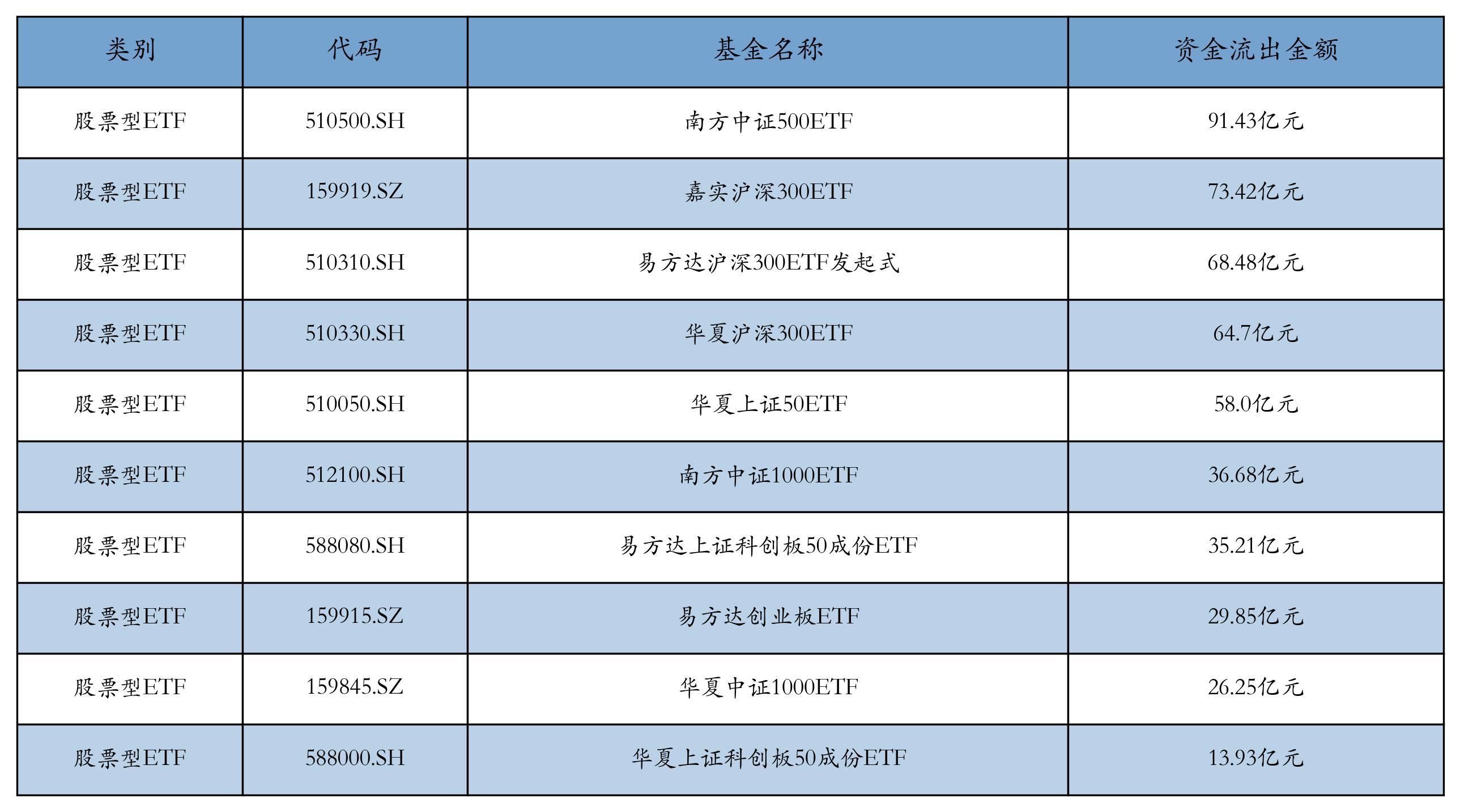 昨日股票型ETF资金流出最多的3只ETF及其流出金额分别为:南方中证500ETF(流出91.43亿元)、嘉实沪深300ETF(流出73.42亿元)、易方达沪深300ETF发起式(流出68.48亿元)。资金流出前10详情见下表: