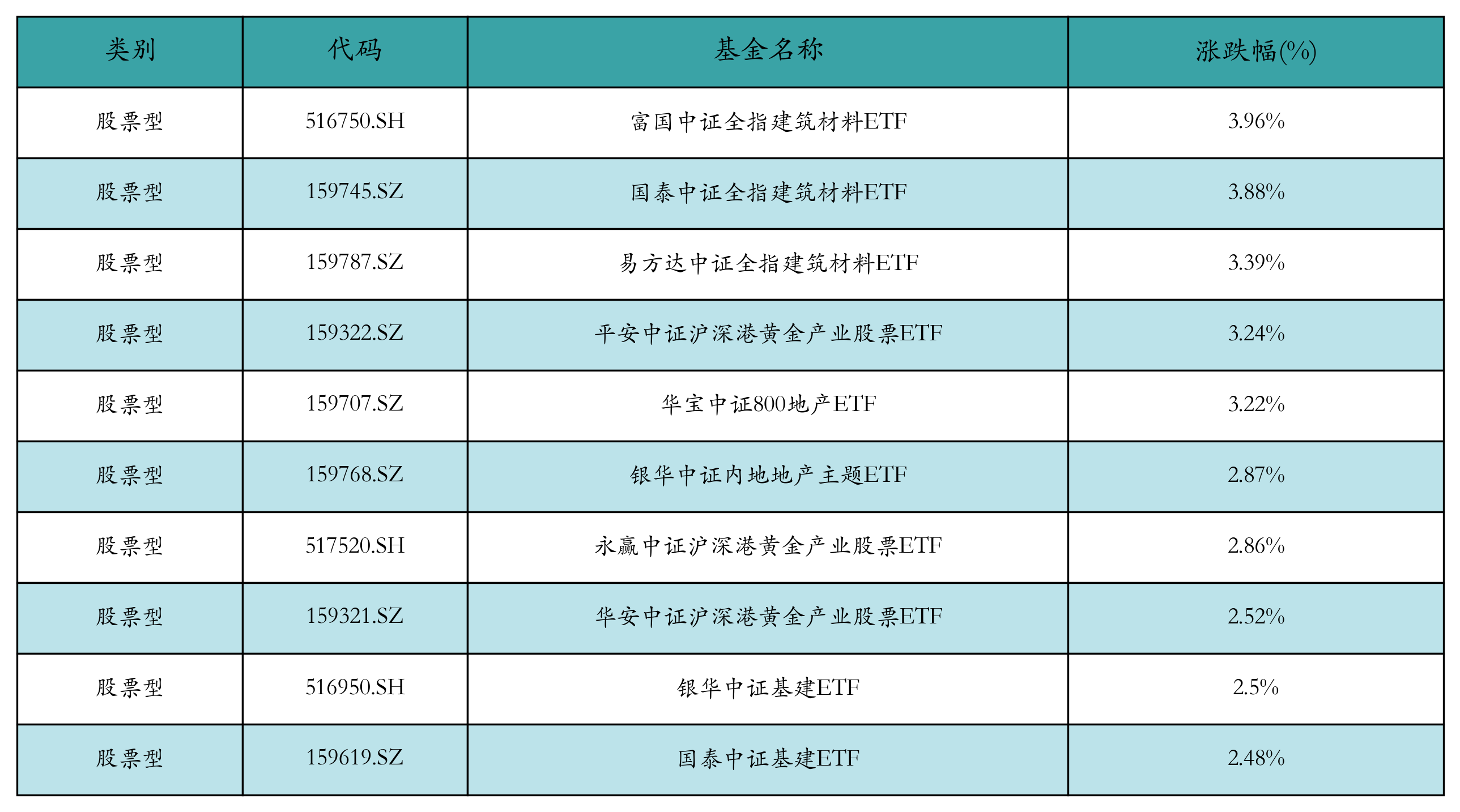 昨日股票型ETF涨幅最高的3只ETF及其收益率分别为:富国中证全指建筑材料ETF(3.96%)、国泰中证全指建筑材料ETF(3.88%)、易方达中证全指建筑材料ETF(3.39%)。涨幅前10详情见下表: