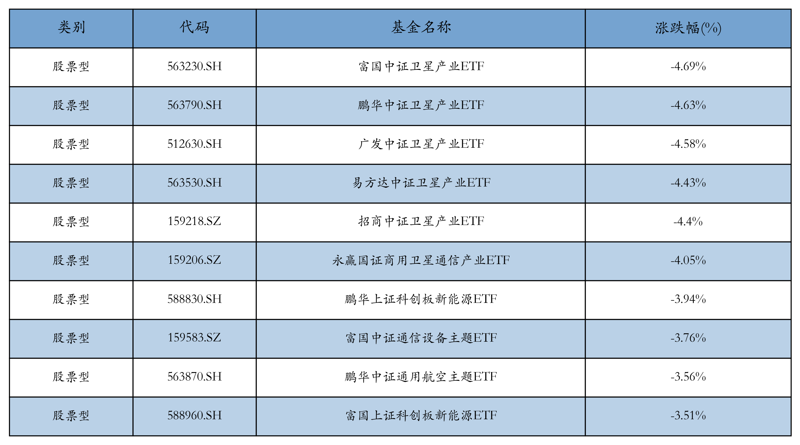 昨日股票型ETF跌幅最大的3只ETF及其收益率分别为:富国中证卫星产业ETF(-4.69%)、鹏华中证卫星产业ETF(-4.63%)、广发中证卫星产业ETF(-4.58%)。跌幅前10详情见下表: