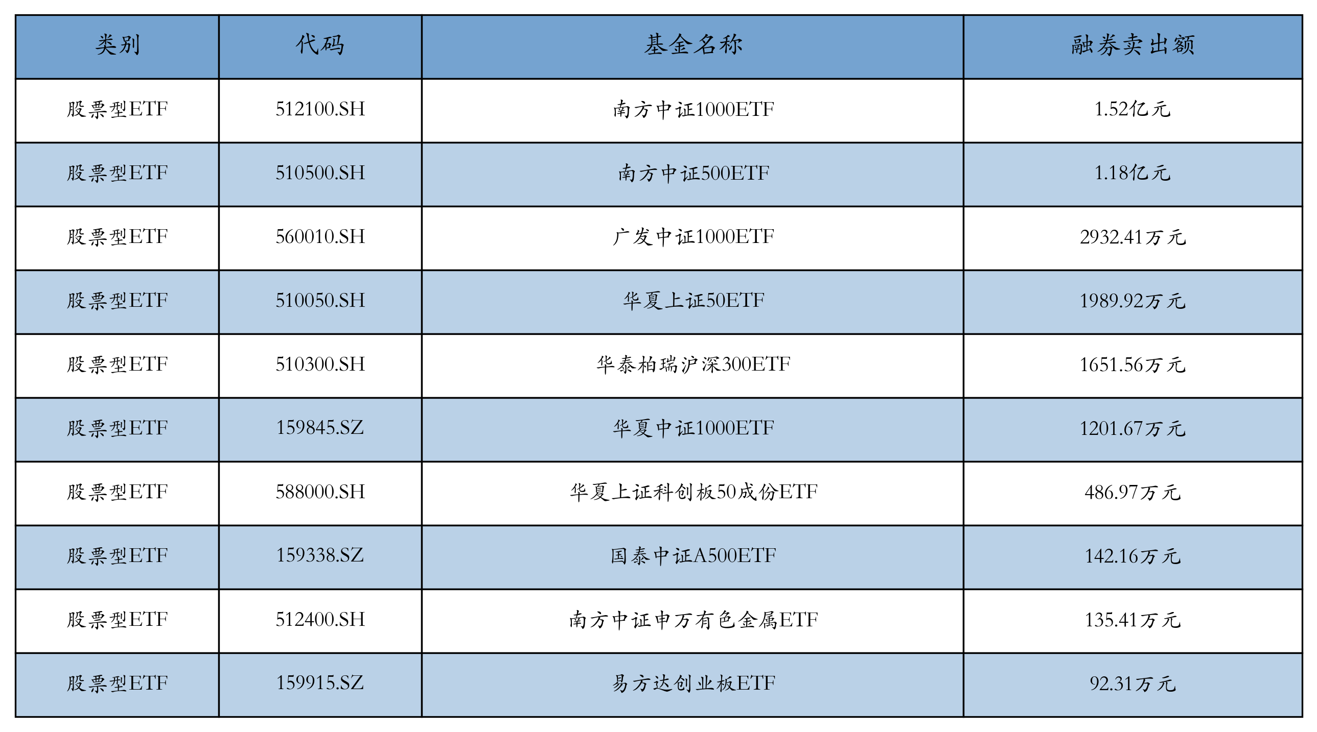 昨日股票型ETF融资卖出额最高的3只ETF及其卖出金额分别为:南方中证1000ETF(1.52亿元)、南方中证500ETF(1.18亿元)、广发中证1000ETF(2932.41万元)。融券卖出额前10详情见下表: