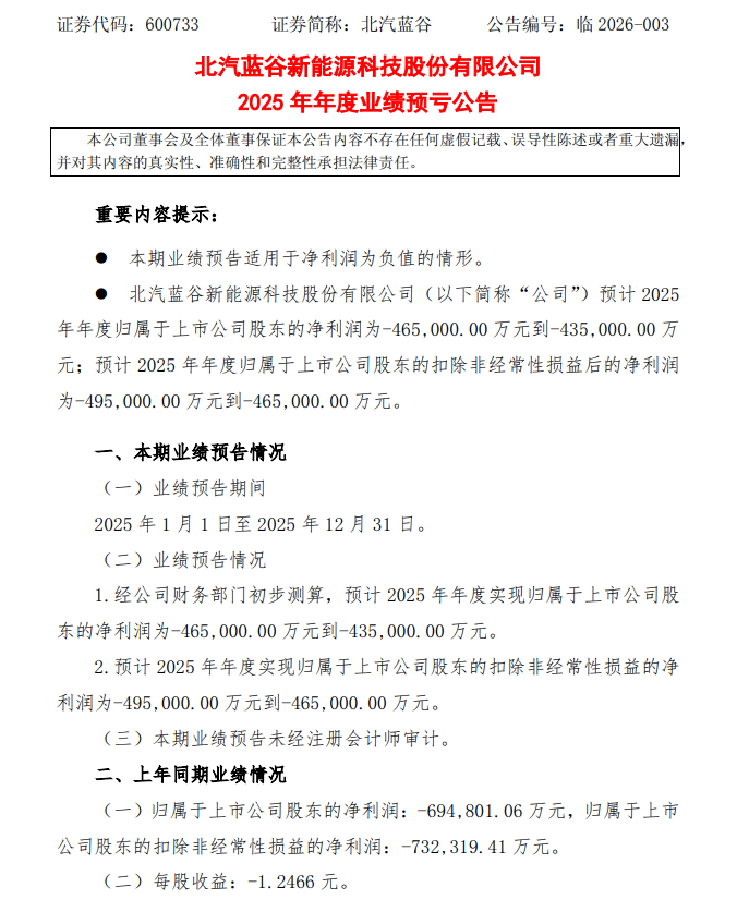 1月19日晚间,北汽蓝谷发布《2025年年度业绩预亏公告》。公告显示,经公司财务部门初步测算,北汽蓝谷2025年归母净利润预计亏损43.5亿元至46.5亿元,同期扣非归母净利润预计亏损46.5亿元至49.5亿元。2020年至2024年,北汽蓝谷年亏损均在50亿元以上,5年间累计亏损超295亿元。再加上2025年的预计亏损,北汽蓝谷在近6年累计亏损超338亿元。