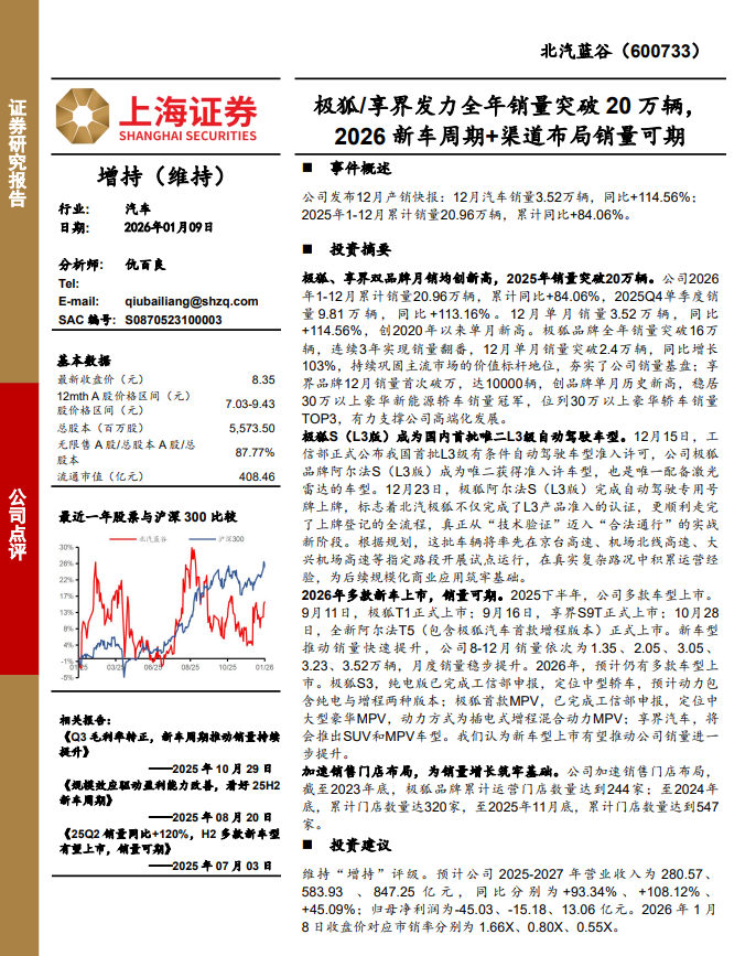 上海证券在最新研报中给予北汽蓝谷“增持”评级,并预计公司2025和2026年归母净利润为-45.03亿元和-15.18亿元,并于2027年实现盈利至13.06 亿元。