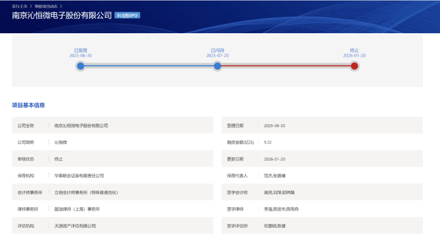 1月20日,上交所官网显示,南京沁恒微电子股份有限公司(简称“沁恒微”)IPO的状态从已问询变更为终止,成为继亚电科技后2026年第二家IPO终止的科创板企业。