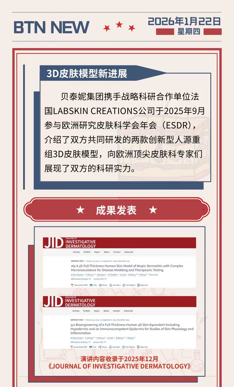 近日,贝泰妮集团于研发上取得新进展,旗下多款核心产品及核心原料已完成基于3D皮肤模型的系统化功效验证。此次验证所依托的两款创新型人源重组皮肤模型,由贝泰妮与长期战略科研合作单位法国Labskin Creations公司共同研发,于2025年9月在欧洲研究皮肤科学会年会(ESDR)上发布,相关研究成果同期发表于皮肤科学领域权威期刊《Journal of Investigative Dermatology》。