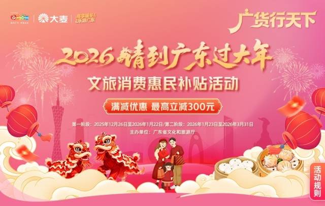 广东省文化和旅游厅联合平台机构推出的2026“请到广东过大年”文化和旅游消费惠民活动迎来新高潮。2026年1月23日至3月31日,用户可领取新一轮广东文旅消费券,覆盖旅游线路、景区门票、酒店住宿、文艺演出、文创产品等全品类文旅消费场景,精准匹配春节团圆游、元宵民俗游、节后错峰游等多元场景,每日9:00限量开抢。