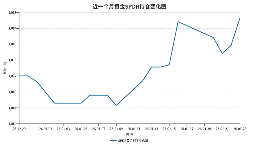据Wind金融终端,截至1月23日,全球最大黄金上市交易基金(ETF)SPDR Gold Trust黄金持仓量为1086.53吨,较前一交易日增加6.87吨。