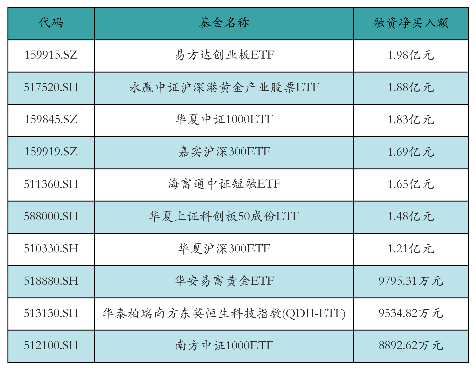 1月29日ETF融资净买入额前三位分别为:易方达创业板ETF(1.98亿元)、永赢中证沪深港黄金产业股票ETF(1.88亿元)和华夏中证1000ETF(1.83亿元),前10具体见下表: