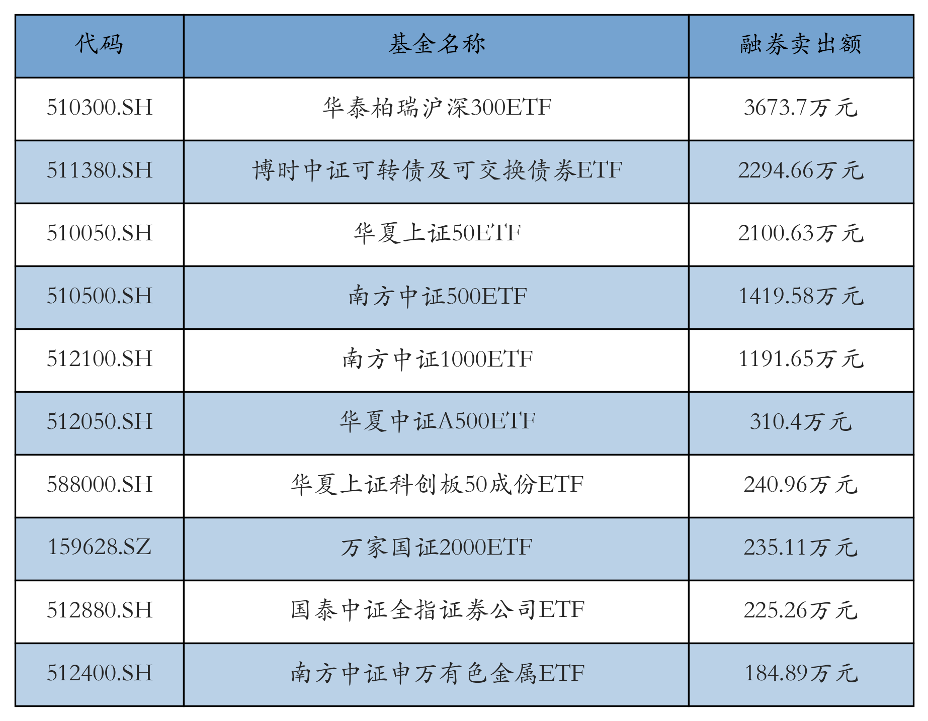 1月29日ETF融券卖出额前三位分别为:华泰柏瑞沪深300ETF(3673.7万元)、博时中证可转债及可交换债券ETF(2294.66万元)和华夏上证50ETF(2100.63万元),前10具体见下表: